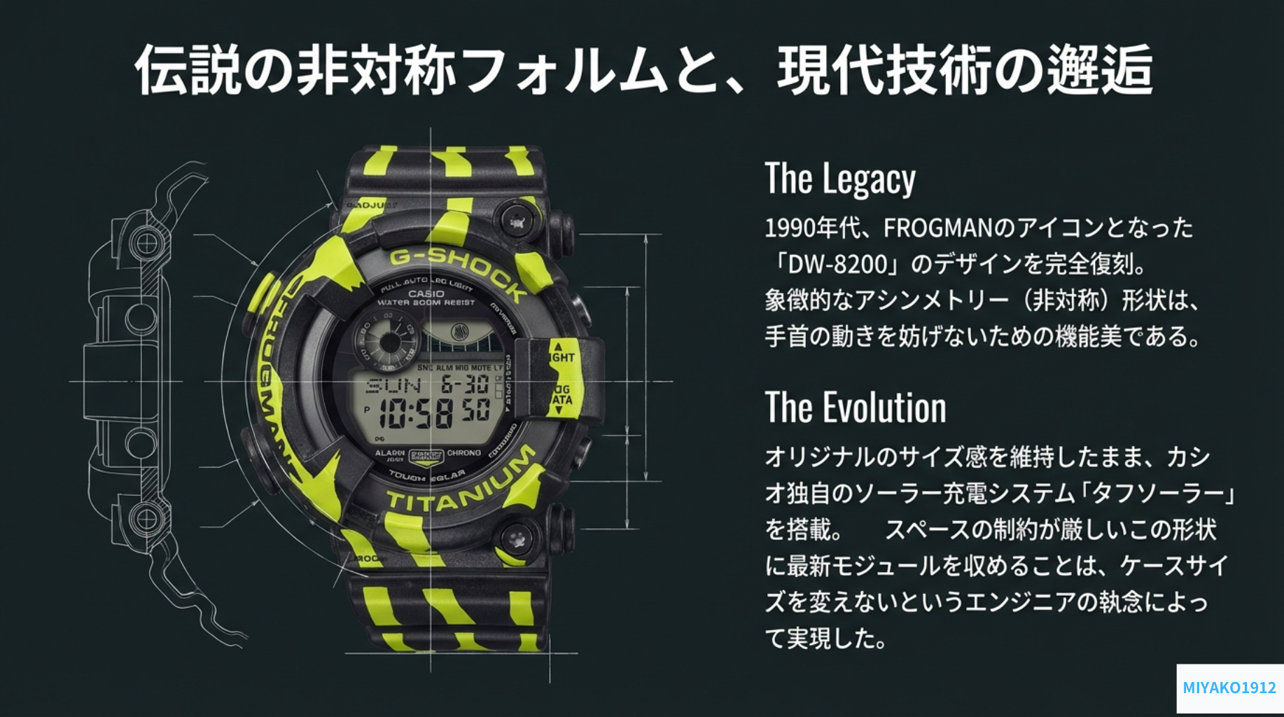 ベースとなっているのは、90年代のストリートカルチャーで神格化された2代目フロッグマン「DW-8200」です。このアシンメトリーな造形を継承しつつ、内部には最新の「モジュール3521」を搭載しています。
