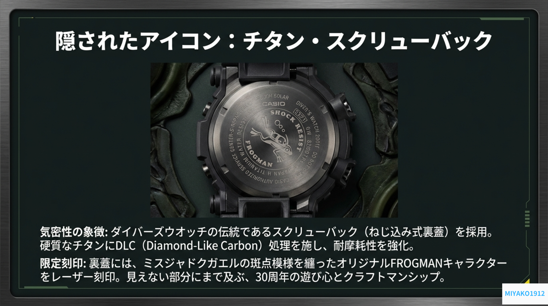 海水に触れるダイバーズとして、究極の耐食性を誇るチタンを採用。さらに裏蓋(スクリューバック)には耐摩耗性に優れたDLC(ダイヤモンドライクカーボン)処理を施し、ミスジヤドクガエルの模様を纏った特別なキャラクターをレーザー刻印しています。自然への敬意を示すバイオマスプラスチックとの融合は、現代の素材工学が到達した一つの完成形と言えるでしょう。