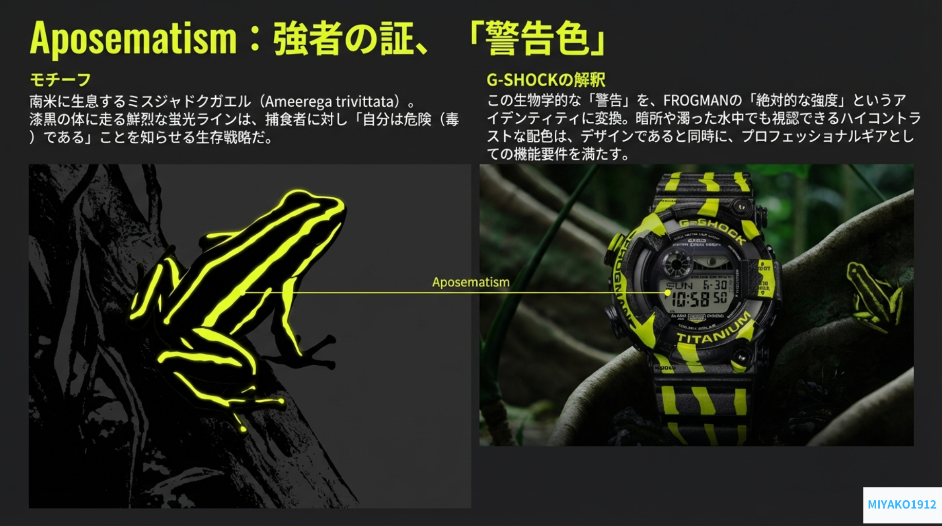 このモデルを一目見た瞬間に受ける衝撃、それは生物学上の「アポセマティズム(警告色)」が持つ根源的なエネルギーによるものです。モチーフとなったミスジヤドクガエル(Ameerega trivittata)は、漆黒の身体に鮮烈な3本のラインを走らせることで、外敵に自らの毒性を誇示します。