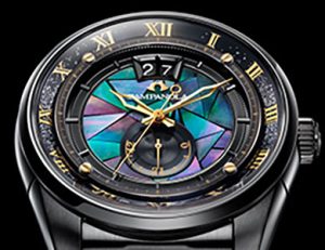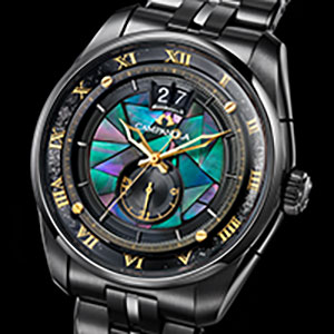 会津塗の伝統工芸士、儀同哲夫氏による螺鈿細工を施した漆塗り文字板を備えるメカニカルモデル。