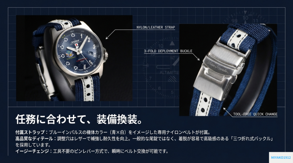 最後に注目したいのは、ナイロンベルトモデルの存在だ。これは決してチタンブレスレットモデルの「廉価版」ではない。むしろ、ケンテックスがいかに細部にまで設計思想を貫いているかを示す、もう一つの完成形である。