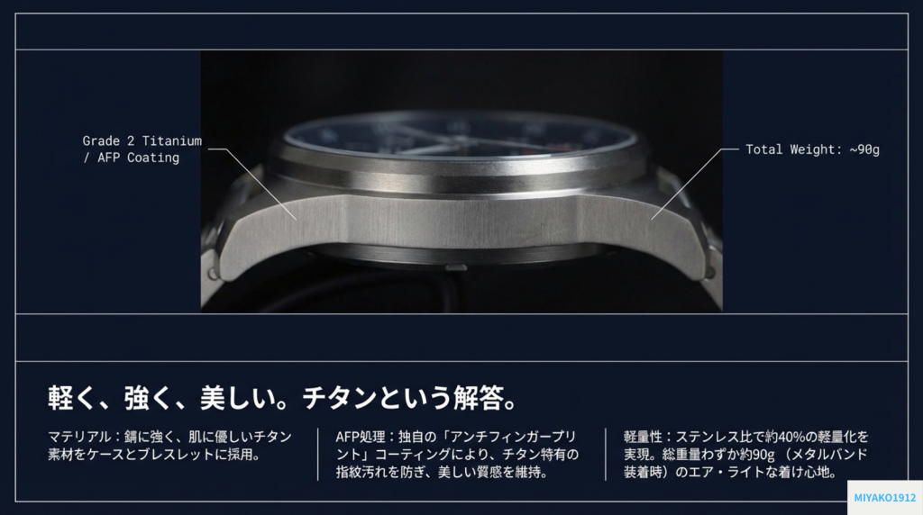 チタンは、一般的な腕時計に使われるステンレススチールと比較して「約40%軽量」でありながら、「約2倍の強度」を誇る驚異的な素材だ。この特性がもたらす効果は、数字以上に劇的である。