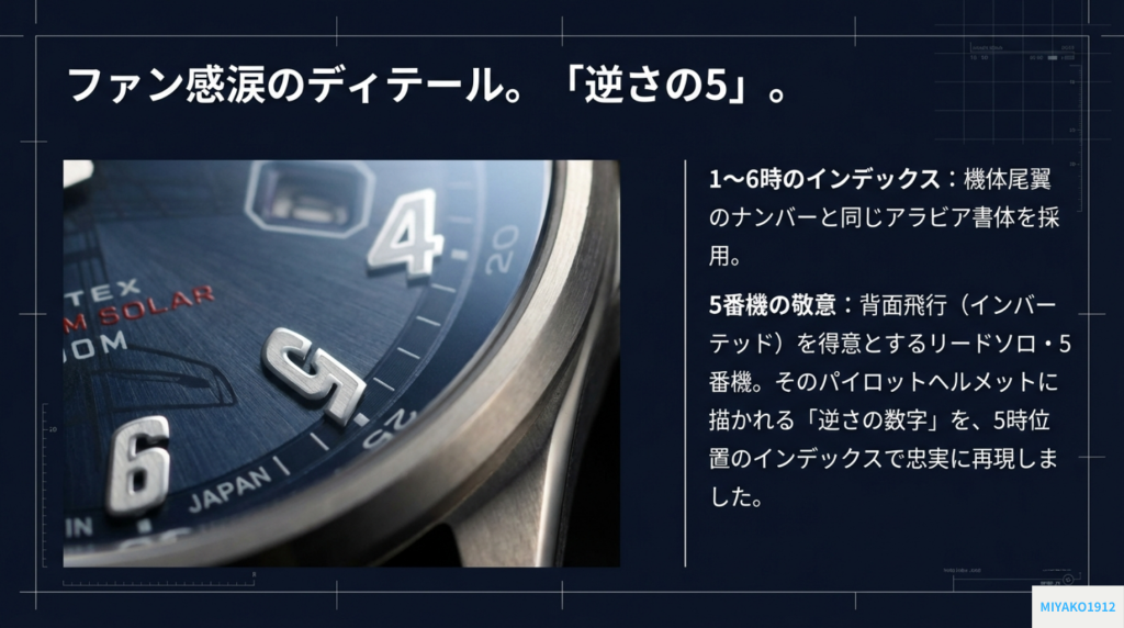 - 逆さの5と尾翼の数字:文字盤の1時から6時のインデックスは、機体の尾翼に描かれるものと同じアラビア書体でデザインされている。中でも5時位置だけは逆さまに。これは背面飛行を多用する5番機パイロットへの敬意を表した、特別なデザインだ。