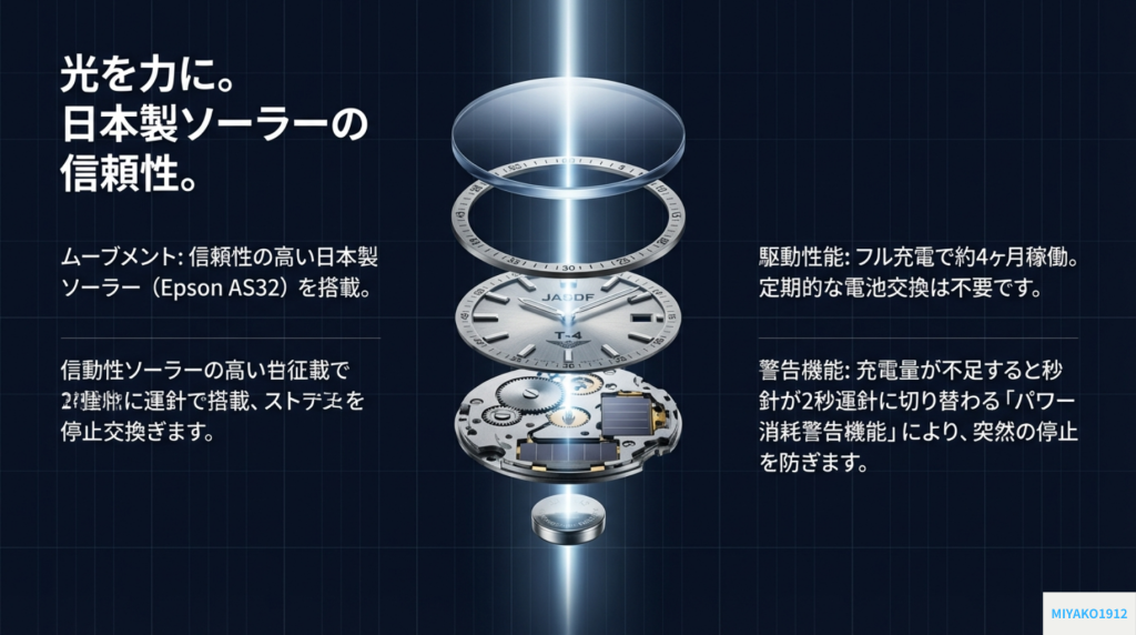 これは、第一の真実である「圧倒的な軽量化と装着感」を達成するために、ケンテックスが下した最もクレバーな決断だ。そもそも、ソーラーウォッチにとって4ヶ月という駆動時間は実用上十分すぎる性能であり、バッテリー残量が少なくなると秒針が2秒運針に切り替わる「パワー消耗警告機能」も搭載されている。過剰なスペックよりも、日々体感できる人間工学的な優位性を優先したのである。この賢明な設計思想こそ、この時計を最も興味深くしているポイントの一つと言えるだろう。