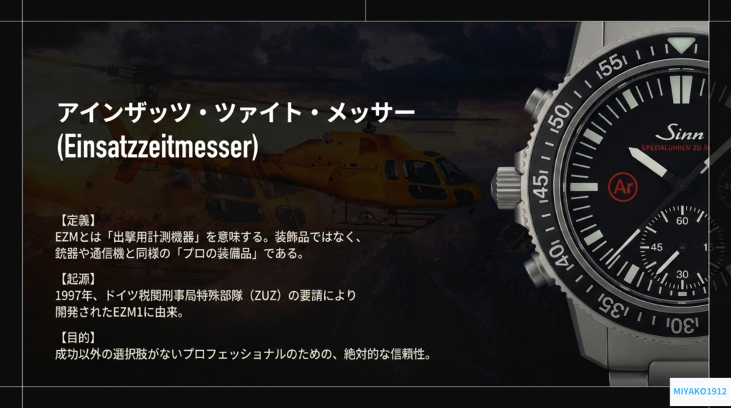 多くの人が「腕時計」と聞いて思い浮かべるのは、ファッションアクセサリーとしての側面だろう。しかし、世の中には銃器や通信機と同じ次元で語られるべき「プロの装備品」としての時計が存在する。その代表格が、ドイツのSinn(ジン)が製造する「Einsatzzeitmesser(アインザッツ・ツァイト・メッサー)」、すなわち「ミッションタイマー」だ。