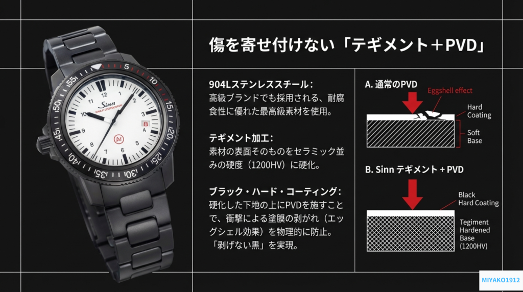 そして、この硬化した下地の上にのみ、ブラック・ハード・コーティングが施される。柔らかい金属の上に硬い塗装をすると、衝撃で下地が凹んだ際に表面の塗装だけが卵の殻のように剥がれ落ちる「エッグシェル効果」が起こる。しかし、テギメントで強化された硬い基盤がコーティングをしっかりと支えることで、この現象を根本から防ぐのだ。これはまさに、身にまとう鋼鉄の盾と呼ぶにふさわしい。