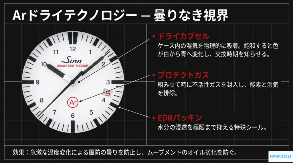 その中核をなすのが「Arドライテクノロジー」だ。これは3つの要素で構成される。まず、ケース内部に不活性なプロテクトガスを充填し、ほぼ無水の環境を作り出す。次に、従来のパッキンに比べ水分の侵入を75%も抑制する特殊なEDRパッキンで密閉。そして、ケース内に設置された硫酸銅入りの「ドライカプセル」が、内部に残留する湿気を物理的に吸収し続ける。このカプセルは水分を吸収するにつれて白から青へと色が変化し、交換時期を視覚的に知らせるという、機能主義の極致ともいえる設計だ。