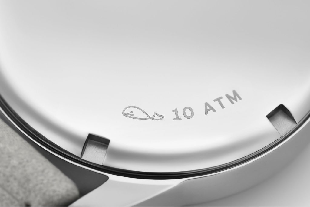 裏蓋には可愛いクジラのマークも刻印されていて、水仕事や突然の雨でも安心な「10気圧防水」という頼もしい機能も備わっています。