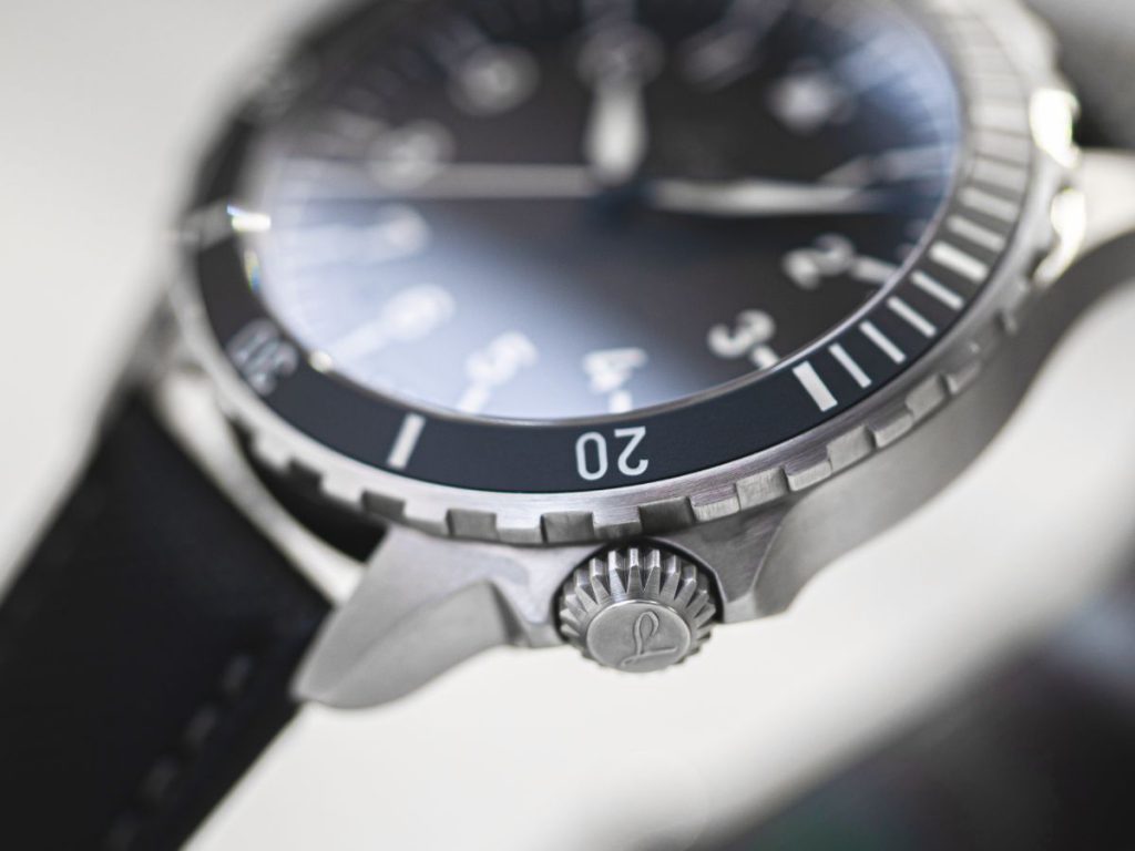 一見すると、「ケルン」は1940年代の初期観測時計の様式である「タイプA(Baumuster A)」文字盤を忠実に再現した、純然たるパイロットウォッチに見えます。しかし、その内実にはダイバーズウォッチに匹敵する20気圧防水という強靭なスペックが封印されています。