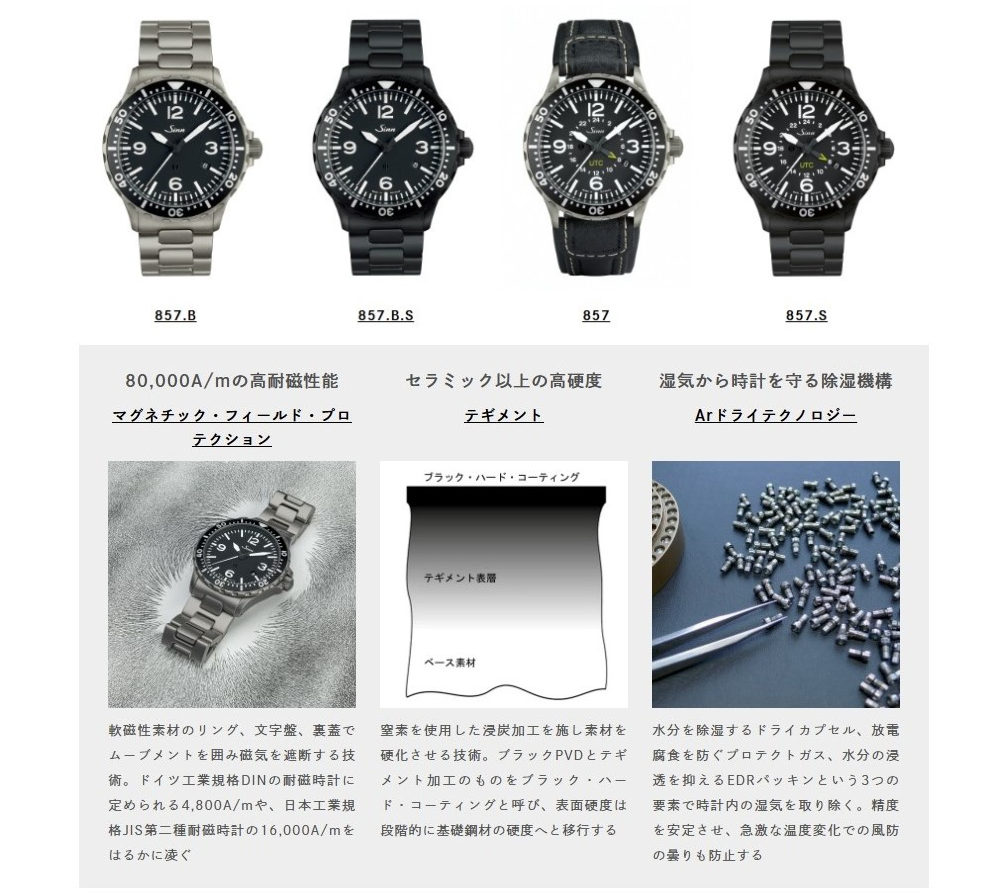 商品の技術も、テギメント/ブラック・ハード・コーティング ( 傷がつきにくい ) / マグネチック・フィールド・プロテクション ( 8万ミリアンペア ) /Arドライテクノロジー (時計を湿気から守る除湿機構) / 特殊オイル ( マイナス45℃から80℃まで正常機能 ) という能力を持っています。