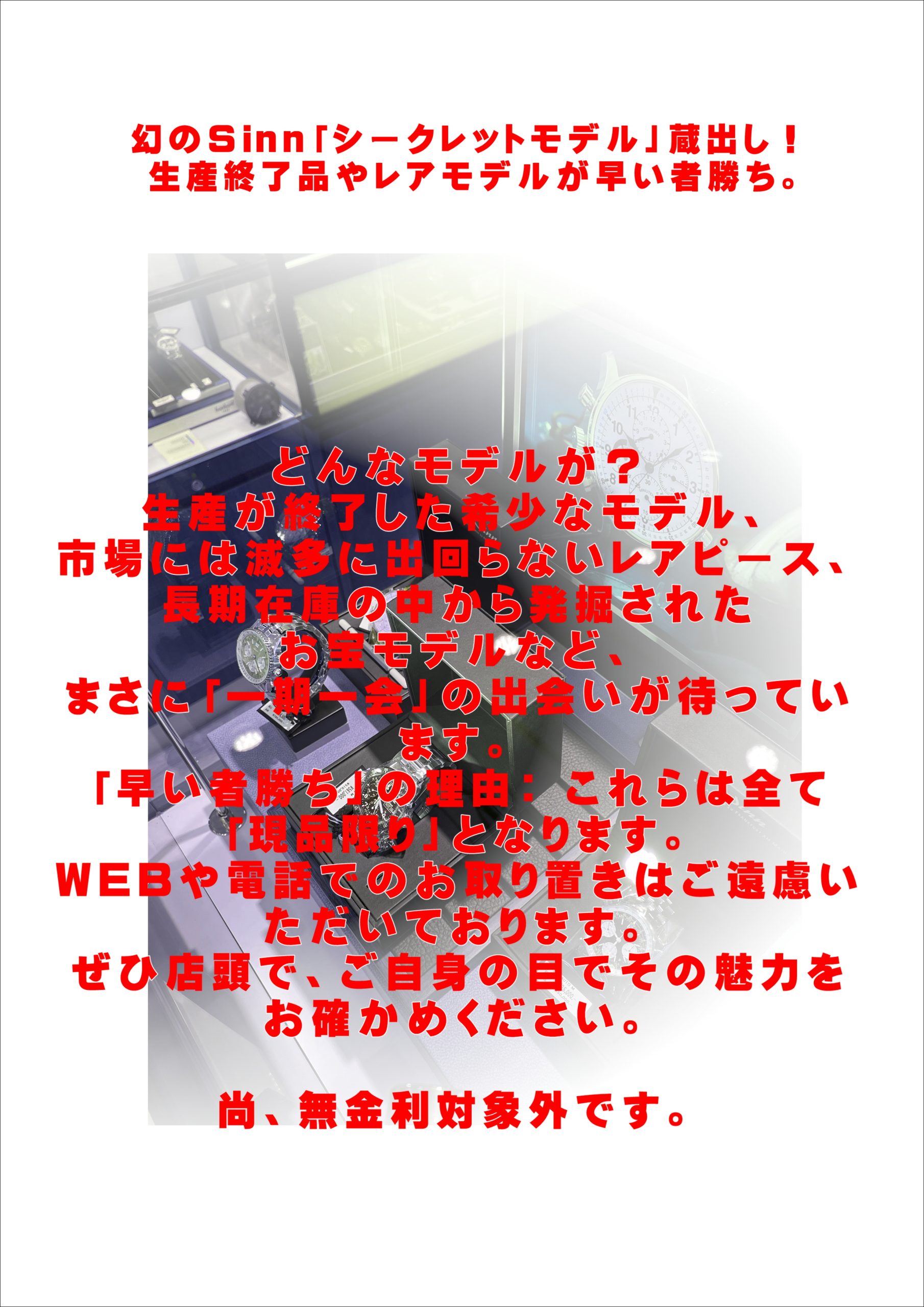 【内容】 当店の金庫に大切に保管されていた、Sinnの**「シークレットモデル」**を、この3連休限定で特別に蔵出し販売いたします。