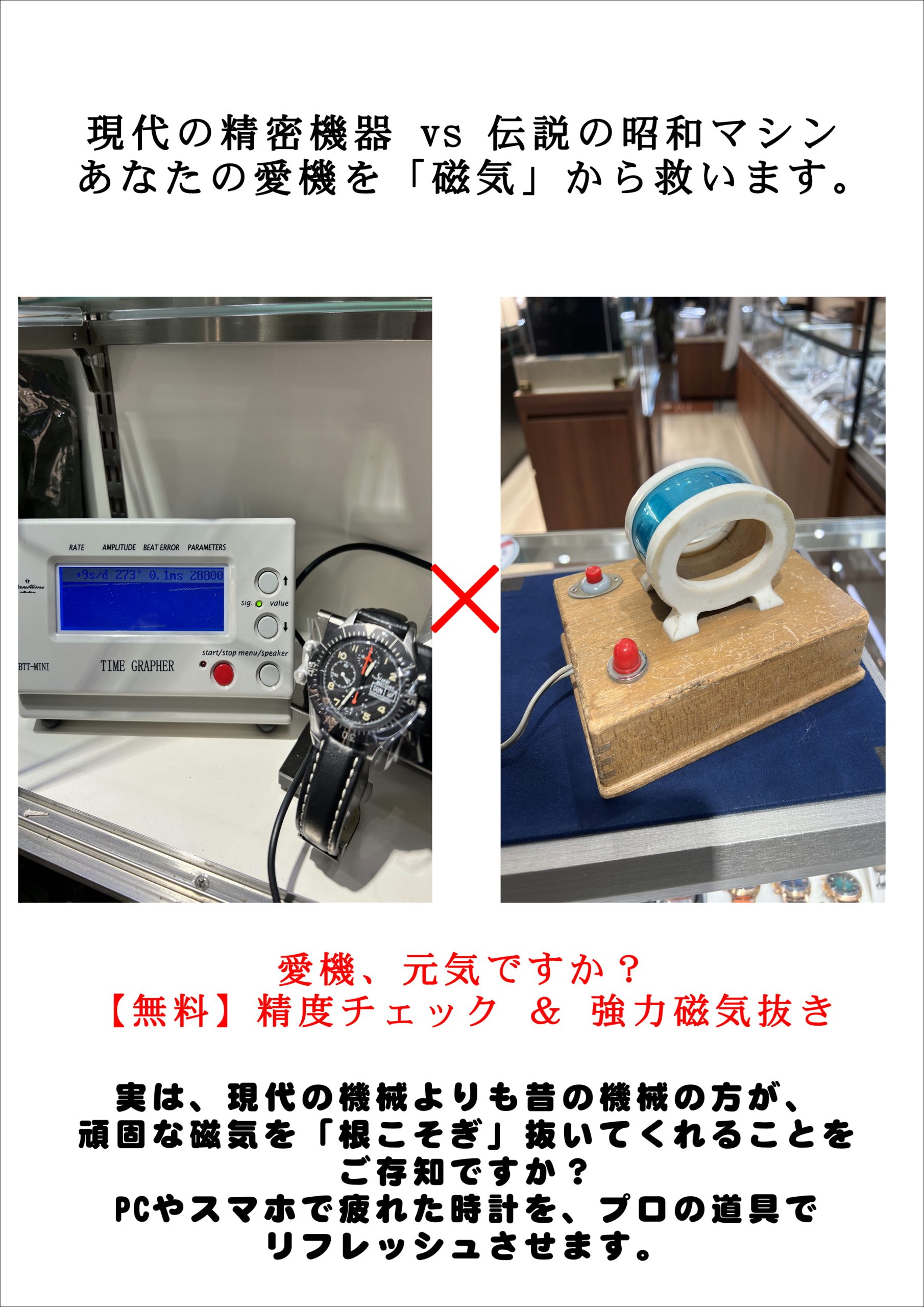 愛機の「クイック診断(磁気抜き)」無料サービス: 期間中、お手持ちの時計の簡易チェックと磁気抜きを無料で行います。パソコンやスマートフォンなどで磁気帯びが気になる方は、お気軽にお声がけください。(※混雑時はお待ちいただく場合がございます。超音波洗浄は行いません。)