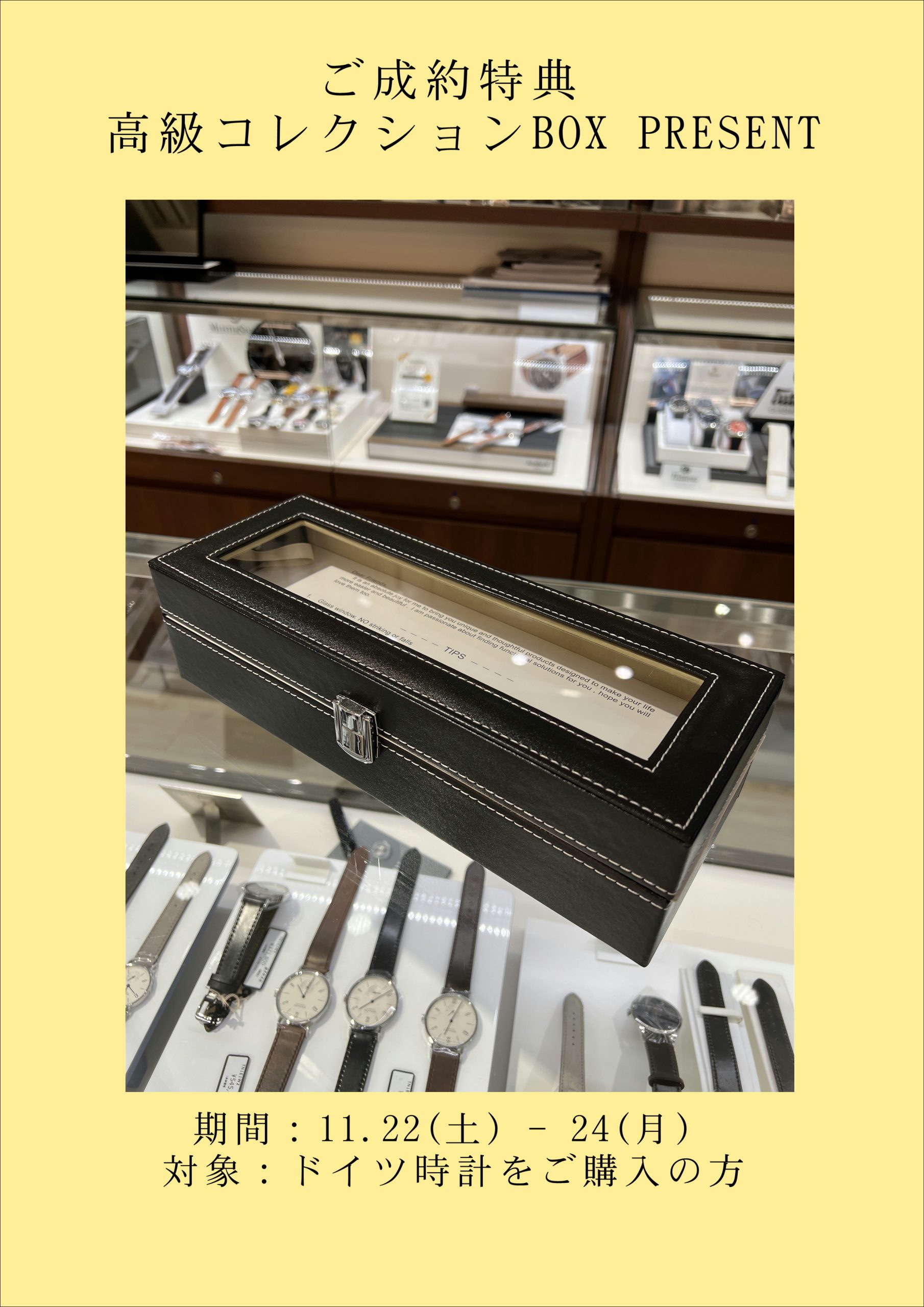 ドイツ時計ご購入で「コレクション時計ボックス」プレゼント: Sinnをはじめとするドイツ時計をご購入いただいたお客様には、大切な時計を美しく保管できる高級コレクションボックスをプレゼントいたします。新しい時計との生活を、より豊かに彩ります。