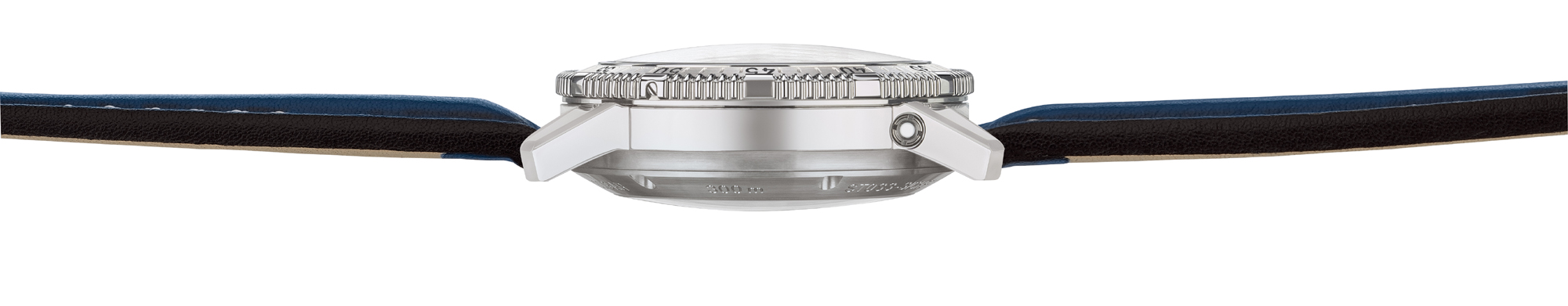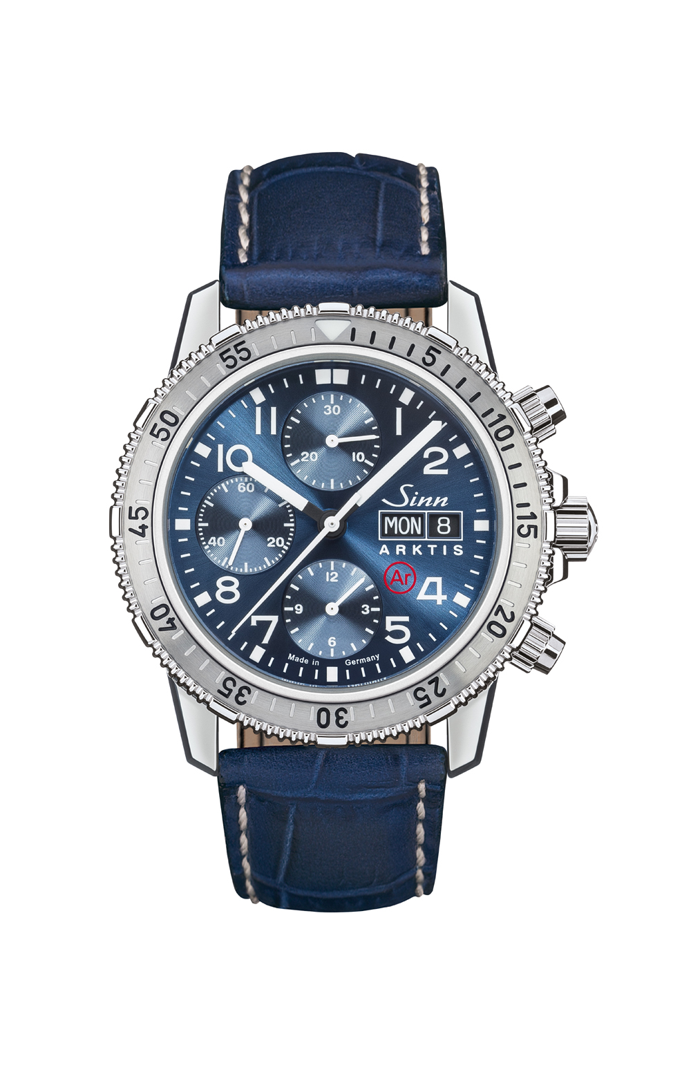 この時計の最も象徴的な特徴は、氷河の氷や極地の海を想起させる、魅惑的なサンレイ仕上げのブルーダイヤルです 。この特別なカラーは、単に美しいだけでなく、ARKTISシリーズのアイデンティティそのものであり、その極地でのルーツを物語っています。光の角度によって表情を変えるサンレイ仕上げは、時計に深みと高級感を与え、白い針とインデックスとの高いコントラストを生み出すことで、あらゆる状況下で最高の視認性を確保します。