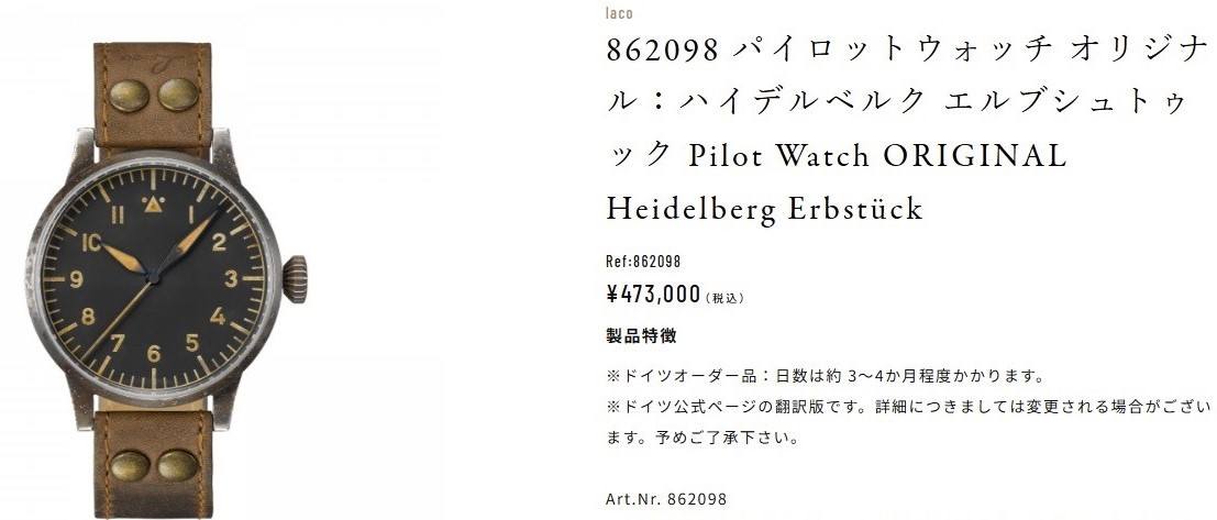 【公式販売ページ】laco 862098 パイロットウォッチ オリジナル:ハイデルベルク エルブシュトゥック ¥473,000(税込)