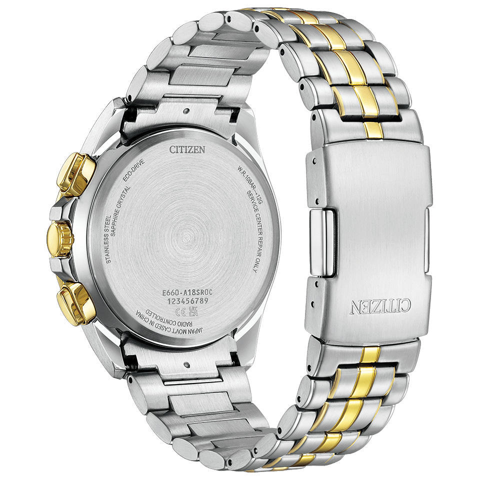 やや大きめの43mmケースに、視認性を確保した夜光付きの太めの針とインデックスを採用したエコ・ドライブ電波時計。バンドの中駒には、ミラー仕上げのゴールドラインをアクセントとしてプラス。文字板、針、りゅうずにもゴールドのパーツを使用した、腕元に華やかさを添える1本です。