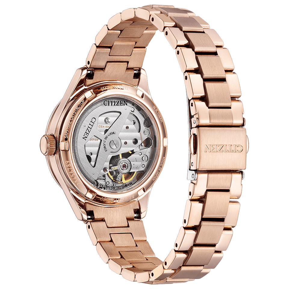 メカニカルウオッチならではの動きが楽しめるオープンハート仕様。7時の位置から覗くムーブメントに重なるように小さな桜の花をあしらいました。