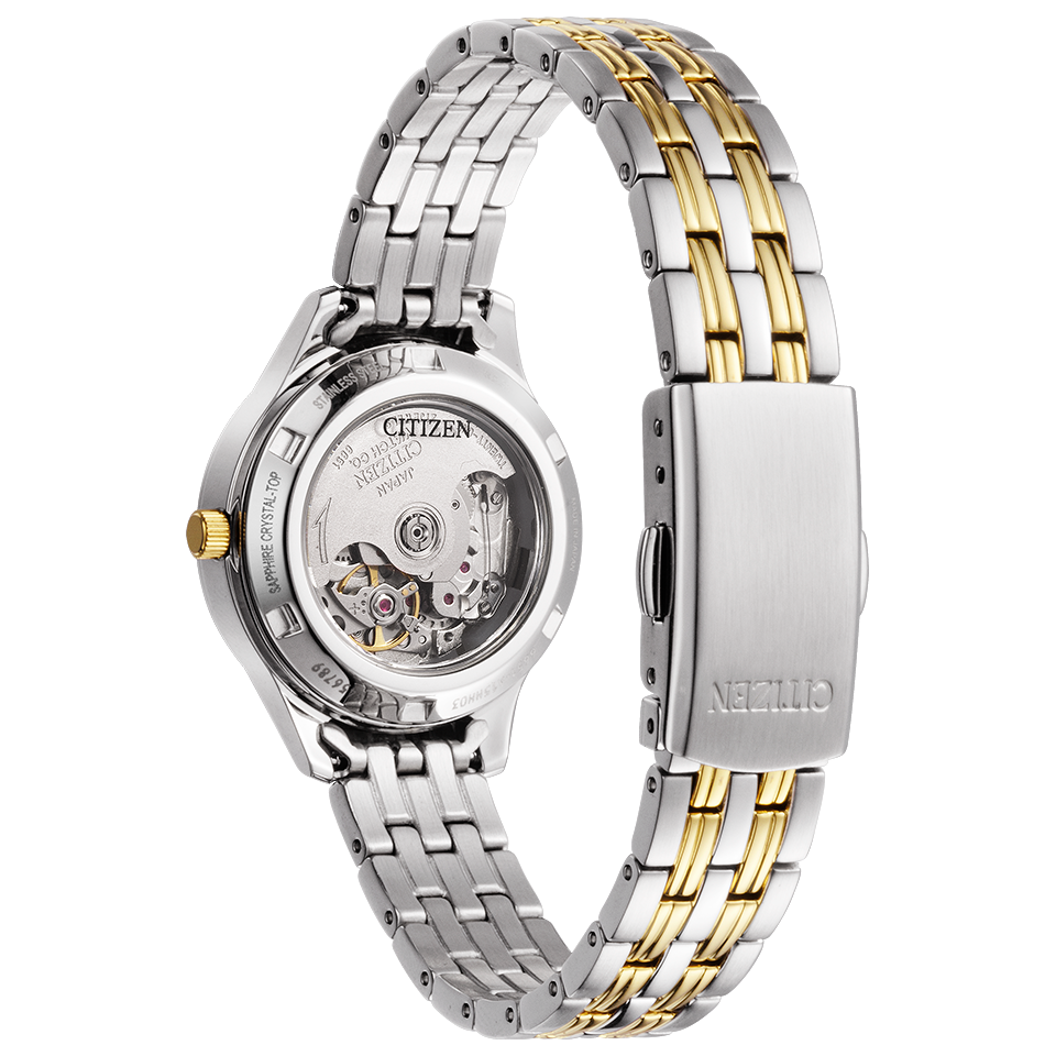 シンプルなデザインにきらびやかなアクセントが映える、デイ&デイト表示付きメカニカルウオッチです。シルバー×イエローゴールドの配色に、インデックスの周りに砂地風のパターンをあしらい、フェミニンな華やかさを演出。裏ぶたは、回転する錘(おもり)や繊細なメカの動きを楽しめるシースルーバック仕様です。