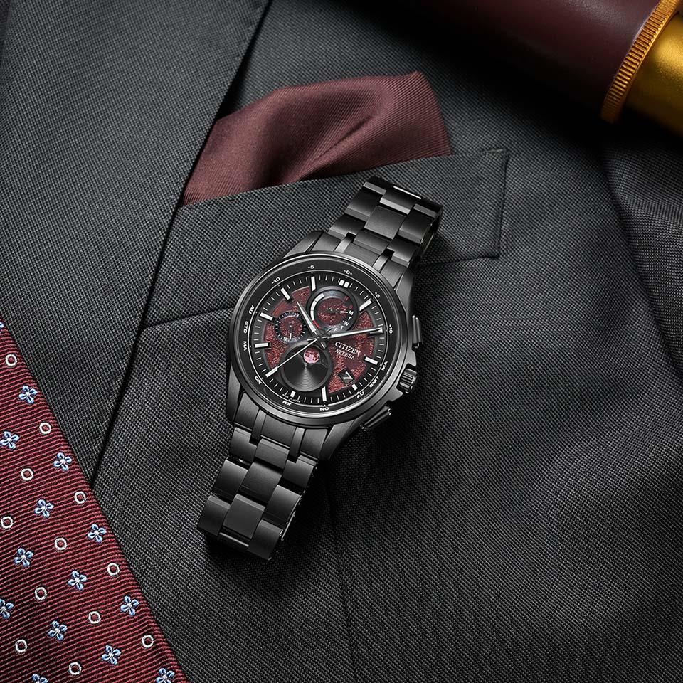 地球、太陽、月が一直線に並ぶ皆既月食をテーマに、特徴的な赤い文字板全体を月に見立てたデザイン。