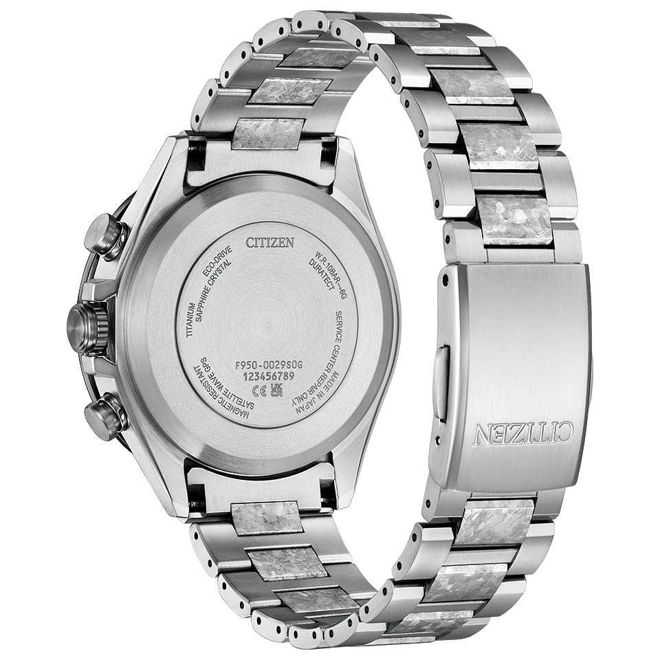 シチズン独自の技術で開発した結晶チタニウムを中駒に採用。デュラテクトプラチナを重ねることで結晶模様がプラチナの輝きをまとい、存在感を放ちます。