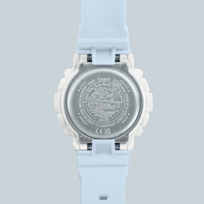 2025年は丸い頭と愛らしい表情が魅力の「スナメリ」をデザインモチーフに採用。体色をイメージしたホワイトをメインカラーに、スナメリが生息する近海をバンドのライトブルーで表現しました。さらに、6時位置のインダイアルリングを「バブルリング」に見立て、鮮やかなブルーを配色。メタル遊環には元気に泳ぐ姿をシルエットで刻印しています。