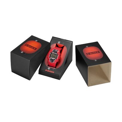 提灯の赤をベースカラーに、ベゼルからバンドまで、G-SHOCKの最たる特徴である「耐衝撃」のプリントを配したユニークなデザイン。バックライトのカラーや持ち手の色味にインスパイアされたボタンと遊環など、こだわりの仕様となっています。裏蓋にも提灯のモチーフを刻印し、パッケージにも赤提灯を大胆にあしらった特別仕様です。