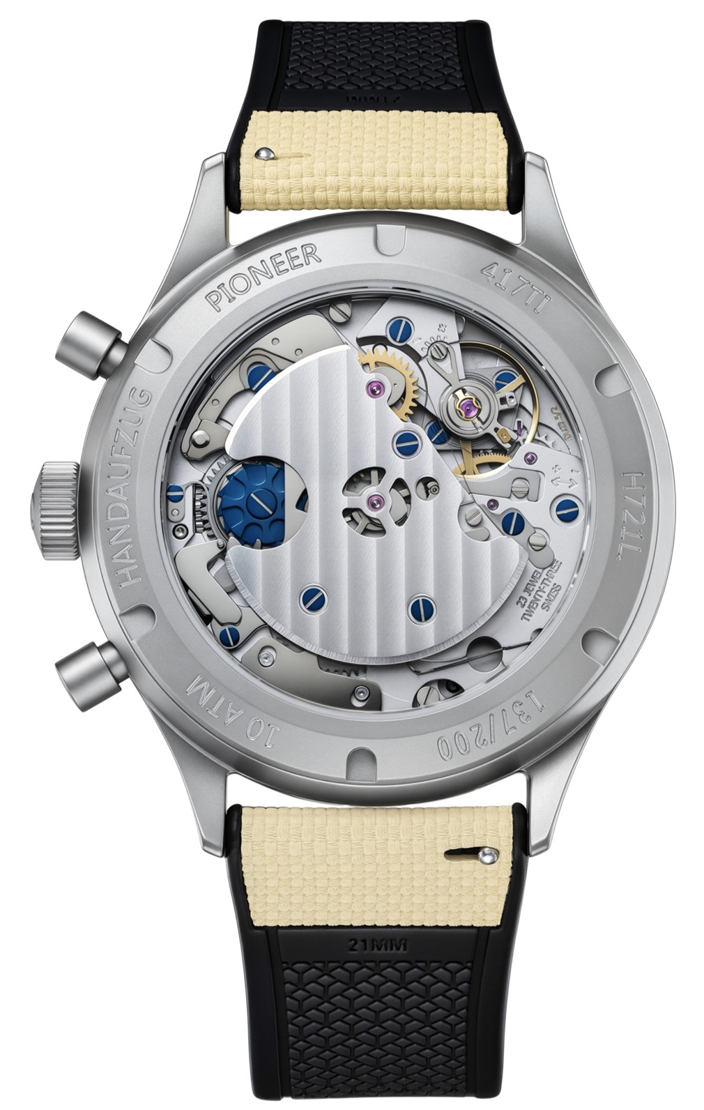内部には、フライバック機能を備えたコラムホイール式クロノグラフ、58 時間のパワーリザーブ、HANHART 基準の 0~+8 秒/日精度調整を備えた手巻きキャリバーAMT 5100が搭載されています。PRIMUS Desert Pilot からインスピレーションを得たこの新しいリミテッドエディションは、砂色のダイヤルやクリアで機能的な美しさといった特徴的なデザイン要素を採用しています。
