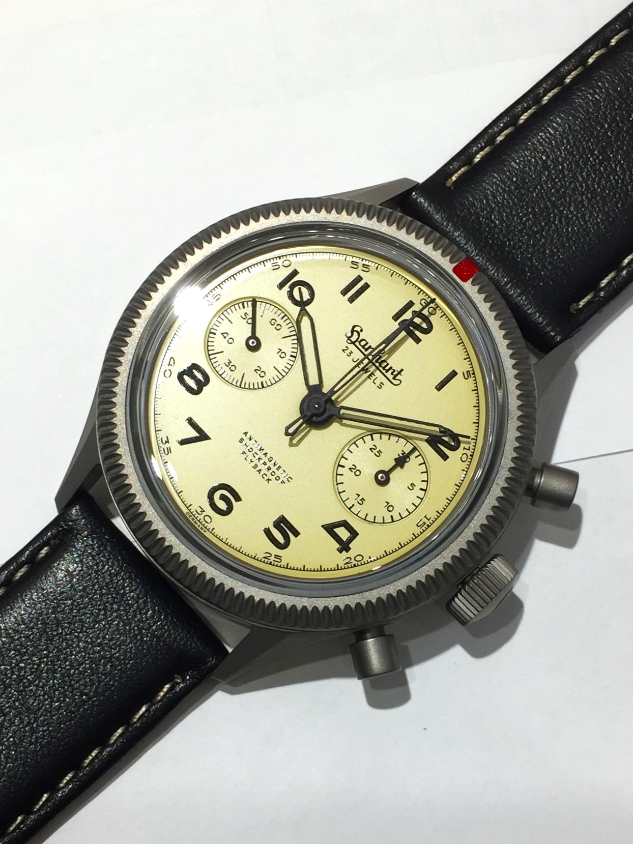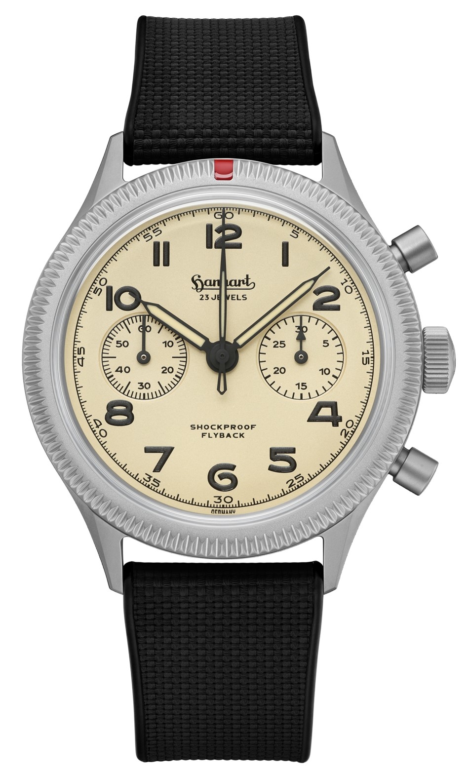 グレード 5 チタン、赤いマーキングが施されたフルーテッドベゼル、そして Hanhart 独自の耐衝撃システムが、現代の探検家のために開発された、妥協のない計器としての個性を強調しています。