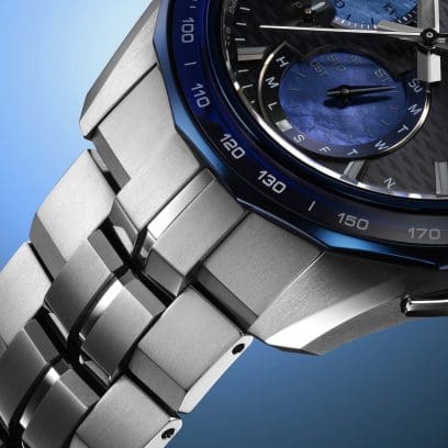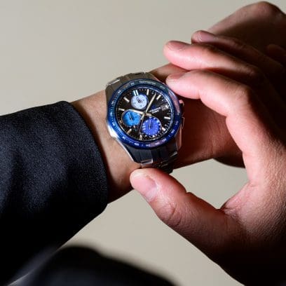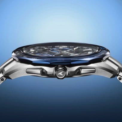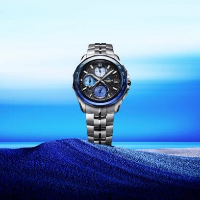 文字板には波をイメージしたパターンをあしらい、光の角度によって異なる表情を見せます。インダイアルには白蝶貝を採用し、阿波藍顔料を混ぜて調色した3色の塗料で着色することでゆるやかに変化する海の深いブルーを表現。サファイアガラスベゼルにはブルーのグラデーション蒸着を施し、ベゼルのチタンパーツにはネイビーのIPコーティングを採用しています。
