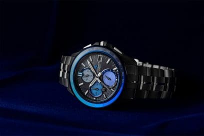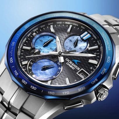 上質な仕上げと薄く美しいフォルムを追求するOCEANUS Manta(マンタ)から、白蝶貝の柔らかな光沢を基調に徳島県産の天然藍「阿波藍」で重なり合う濃淡を表現したモデルです。
