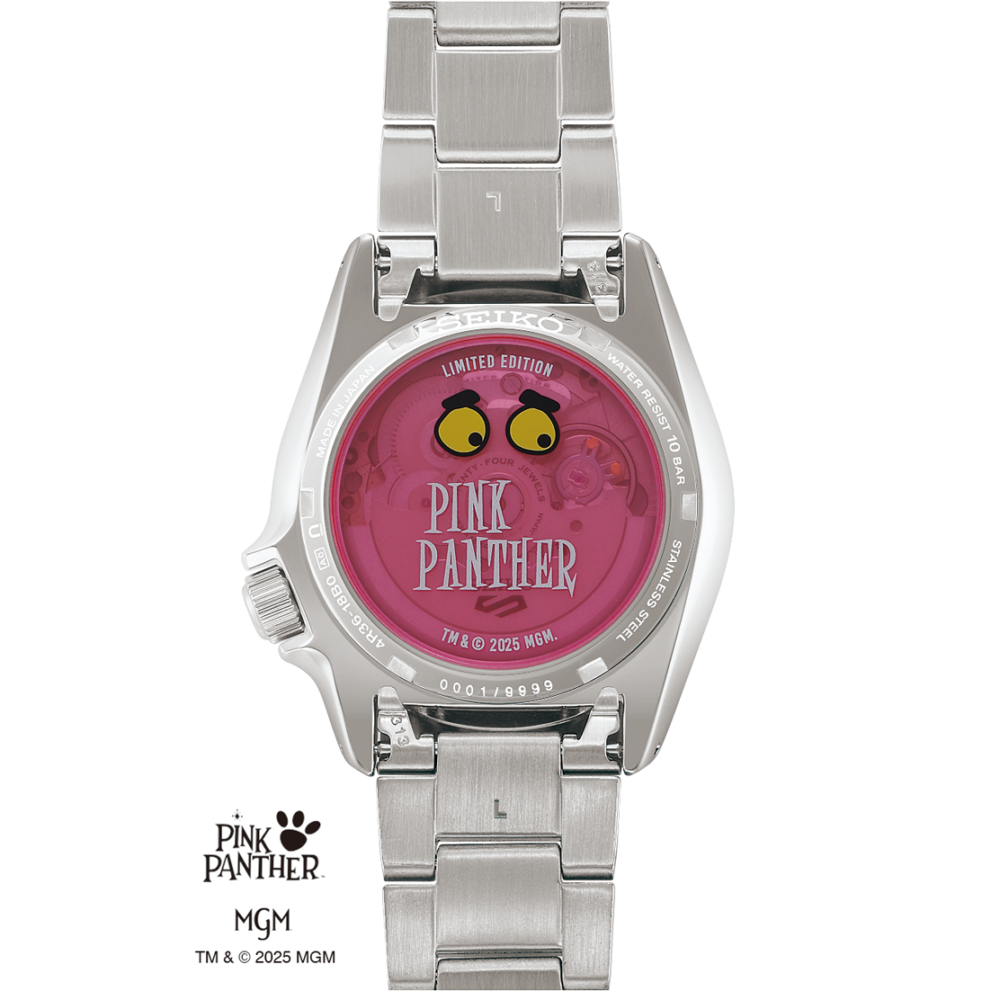 本作は<セイコー 5スポーツ>SKXシリーズをベースに、短編アニメ「The Pink Phink(ピンク騒動)」の世界を表現したモデルです。ピンクパンサーがいたずらでリトル・マンの家をピンクに塗り替えるストーリーを腕時計全体に落とし込み、ダイヤルやベゼル、秒針にシグネチャーカラーのピンクを採用。さらに、リトル・マンがピンクパンサーを見つけるきっかけとなった足跡をダイヤルにあしらい、遊び心あふれる一本に仕上げました。