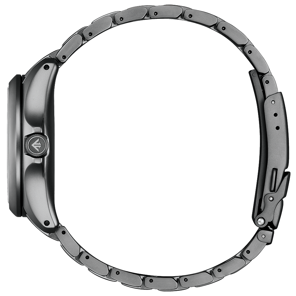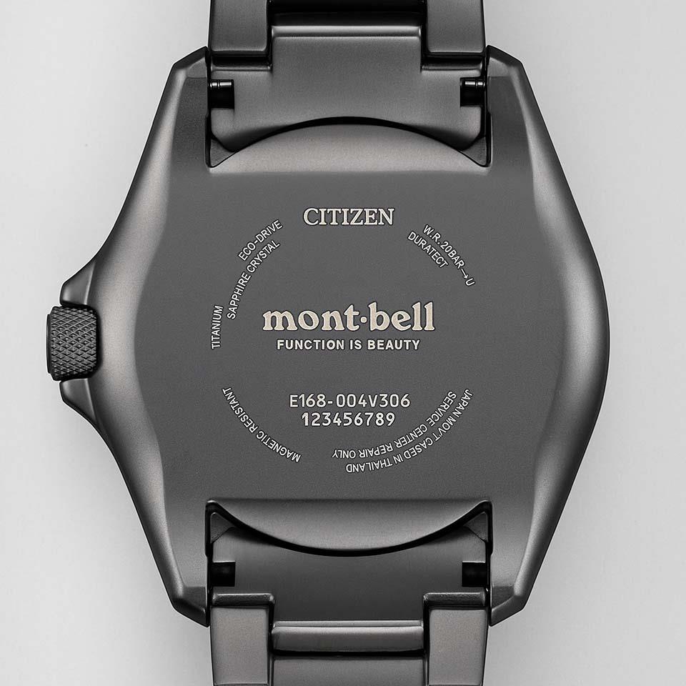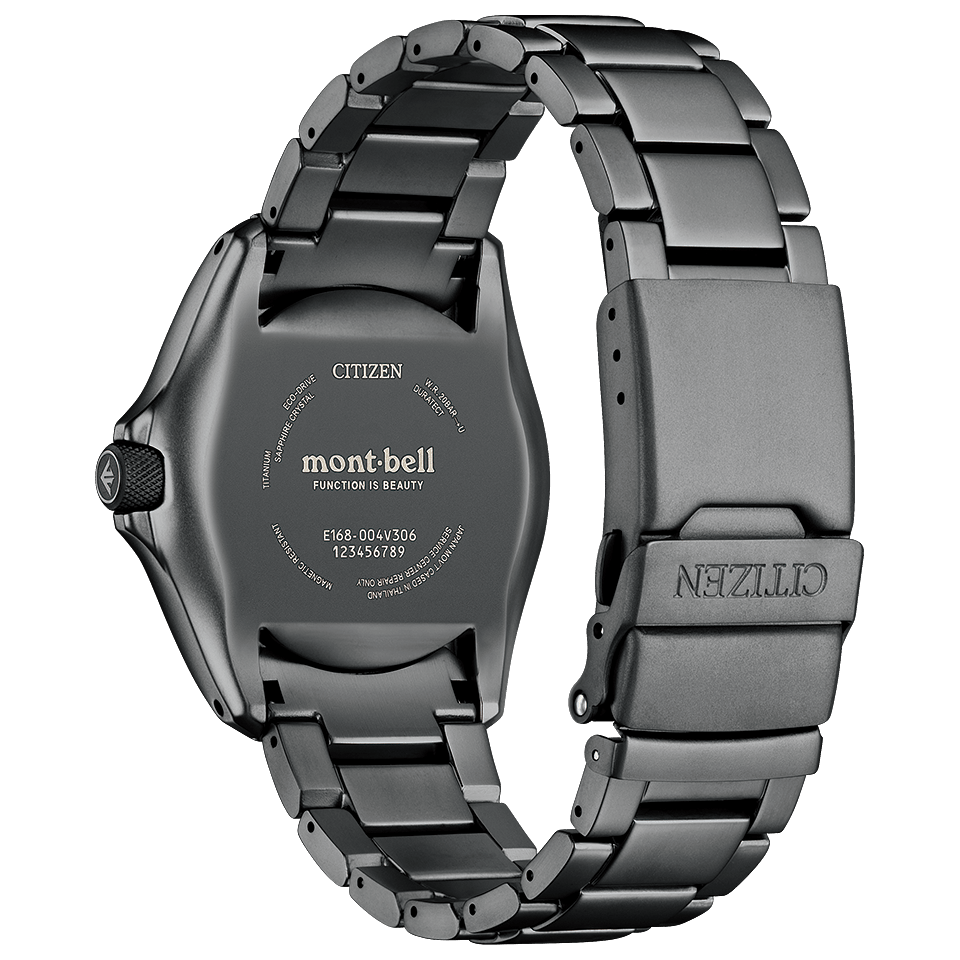 ダイバーズウオッチ用に開発されたCal.E168を搭載。アウトドアのハードな環境にも耐え抜くタフさ、昼夜問わない時刻の見やすさ、操作の簡単さといった、優れた実用性を備える1本です。ケースとバンドには打ちキズにも強いデュラテクトMRK+DLCを施しています。また、衝撃で外れないようメタルバンドにはダブルロックバックルを採用。裏ぶたレス構造のケースバックには、モンベルのブランドロゴをレーザー刻印。CITIZEN×mont-bellのロゴが入った専用ボックス付きです。