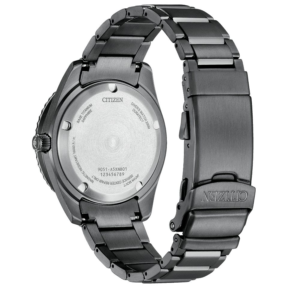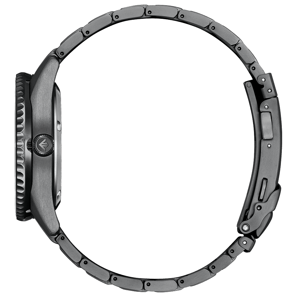 1983年にオーストラリアのビーチで発見され、フジツボに覆われながらも稼働したことから“フジツボダイバー”として愛された、レガシーモデルのデザインを継承したメカニカルダイバーズウオッチが登場。16000A/mの優れた耐磁性、ケースの厚みを抑えた快適な装着感など、仕様や素材を現代的にアップデートしました。光沢感のあるブラックの外装には、小さなキズがつきにくくタフな仕様のデュラテクトDLCを採用。中央のグレーからブラックに変化するグラデーションの文字板は、海中の暗がりに太陽光が微かに差し込む情景を表現しています。針やインデックスの枠仕上げもブラック基調でまとめ、一体感のあるデザインに仕上げています。