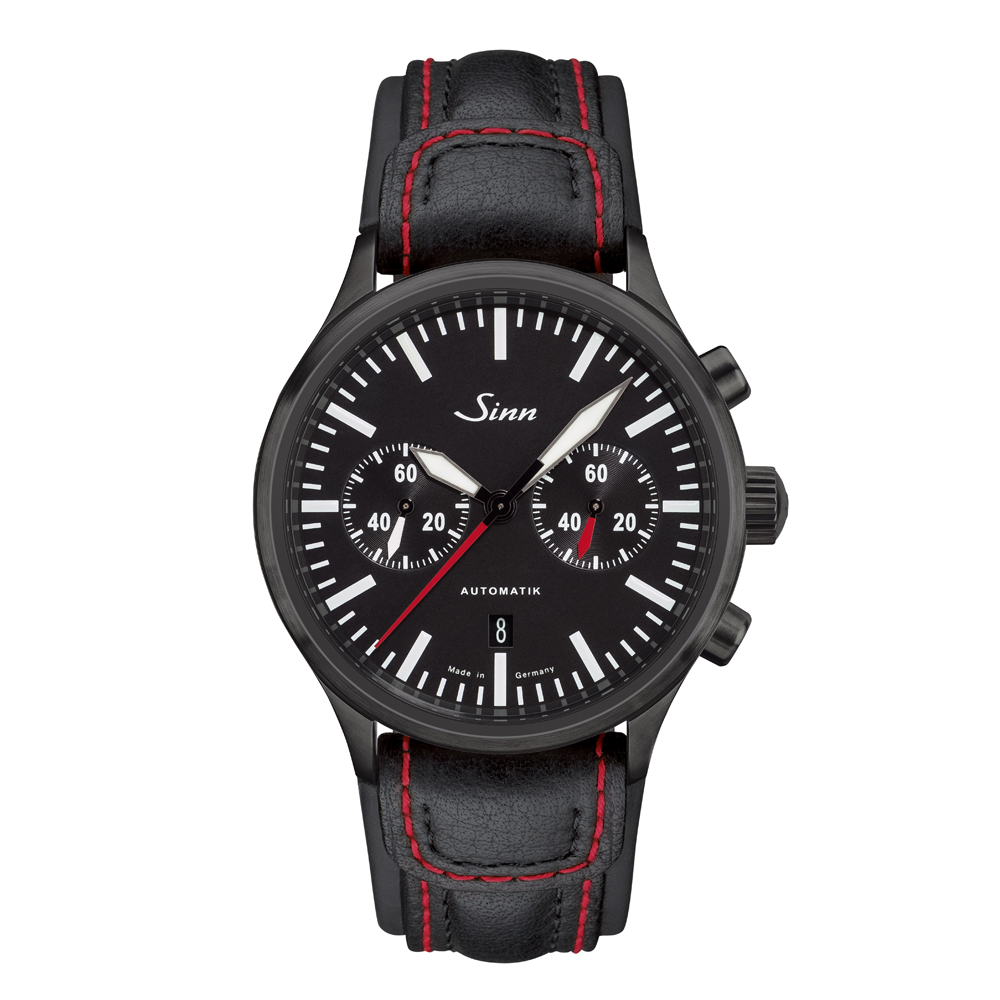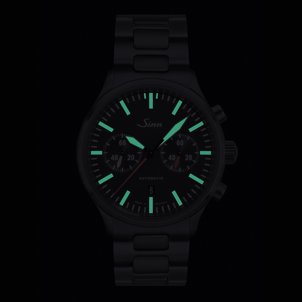 時計の内部には、Sinnの自社製クロノグラフ・ムーブメントSZ05を搭載しています。60分クロノグラフ積算計を3時位置に、時計秒針は9時位置に配置しています。文字盤は長い期間でも明瞭さを保ち、最適な視認性をもたらすよう設計しています。インデックスおよび時針・分針には白の夜光塗料を施しており、暗所でも確実に時刻を読み取ることができます。さらに、耐磁性能、10気圧までの耐水性能、および減圧耐性を備え、機能性をさらに高めています。