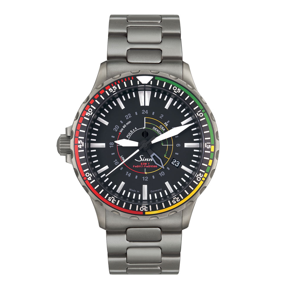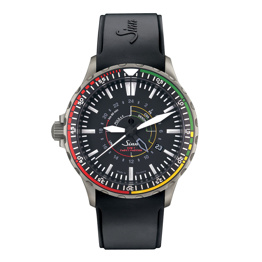 モデルEZM7は、消防の専門家である上級消防監査官の協力により開発された特殊部隊のためのミッションタイマーです。消防隊やレスキュー隊が呼吸保護具使用時に必要なCSA(化学防護服着用時)からLPA(長時間型の自給式呼吸器使用時)の数値を瞬時に読み取ることができる色分けされた回転ベゼルとダイヤルデザインが特徴です。これはドイツ消防協会マニュアルの規定に基づいた許容最長作業時間を示しており、テロ対応専門部隊救出活動の基準ともなるものです。テギメント加工、ドライテクノロジー、特殊オイルの使用などジン独自のテクノロジーを満載し、ヘビーデューティーな使用にとって理想的なプロフェッショナルウォッチです。レスキュー隊の海外遠征を想定し、第二時間帯表示も備えています。