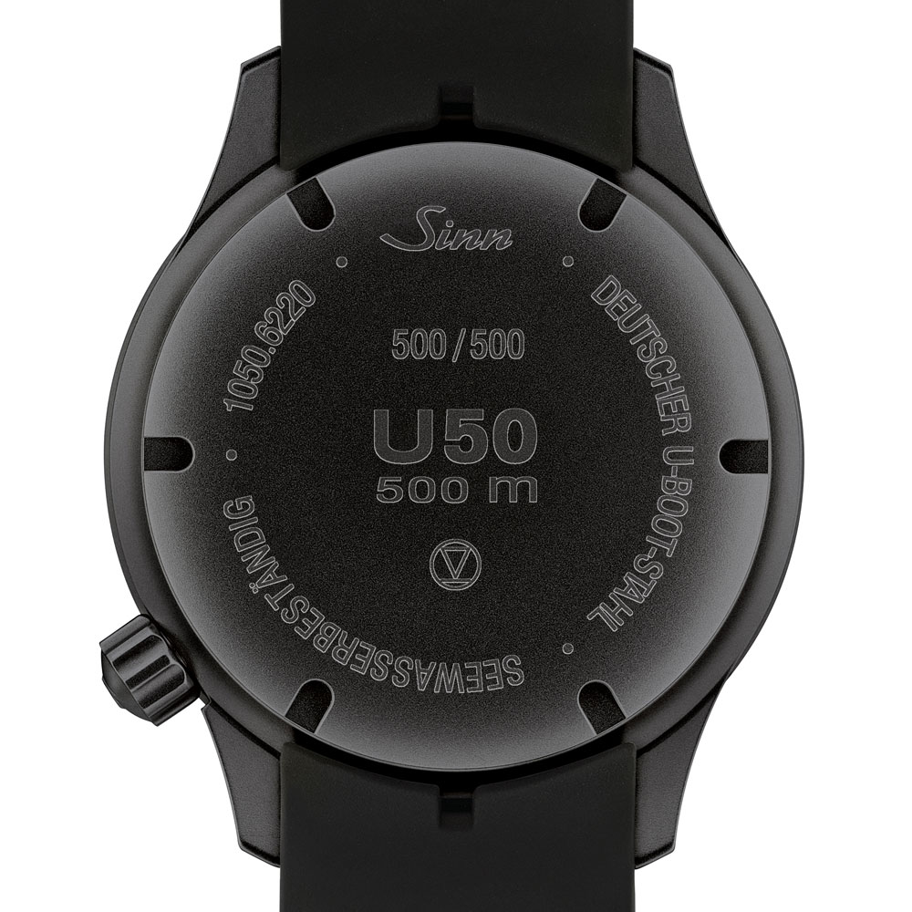 手の甲に当たらないようリューズを4時位置に配した時計ケースには、高い海水耐性を持つドイツ潜水艦の鋼鉄Uボート・スチールを採用しており、極めて高い強度と優れた非磁性特性を持っています。特殊結合方式により固定された逆回転防止ベゼルは、絶対に外れることがないため設定した時間が失われるのを防ぎます。水深500m(=50気圧)の耐圧性は欧州潜水器具規格に基づき、独立した船級協会DNVによって検査・認証され、耐温度性や機能性も認証されています。裏蓋にはシリアル番号が刻まれています。