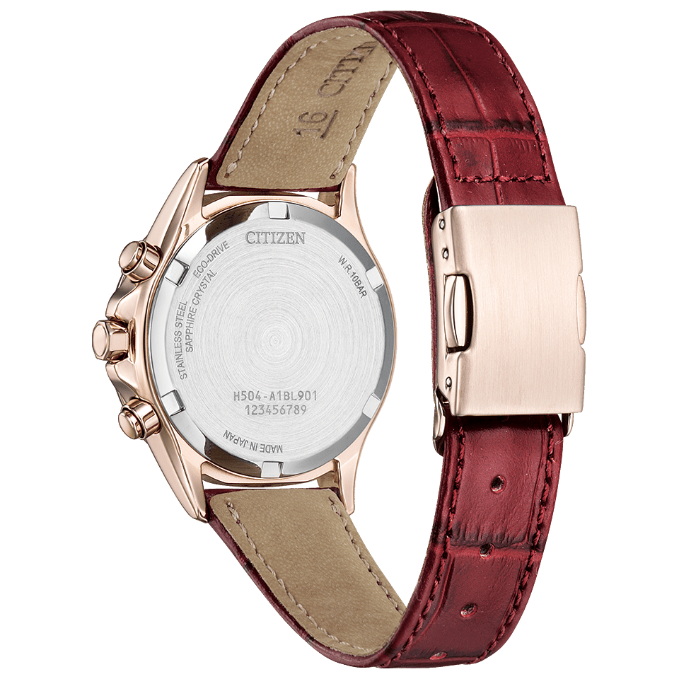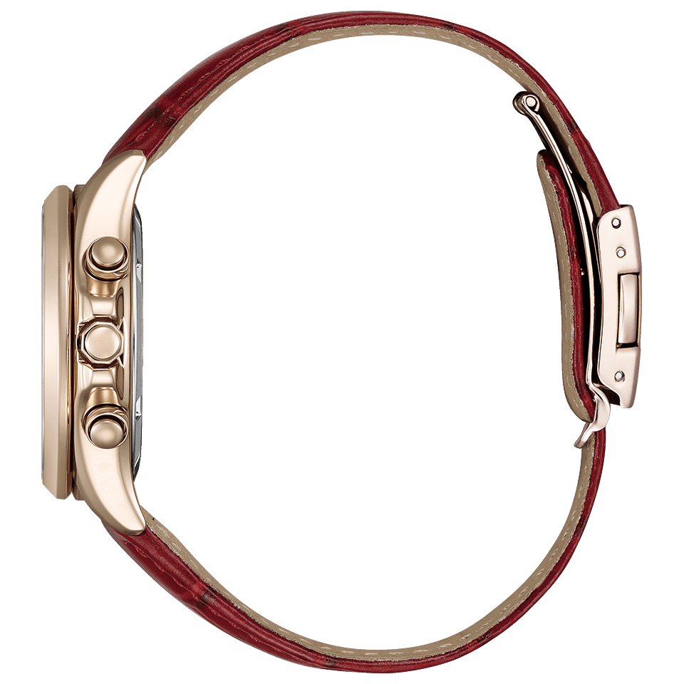 インデックスにはローマ数字を採用し、すっきりとした印象に仕上げました。型押しされたダークレッドの革バンドが上質感を高め、手元を美しく、女性らしく引き立てます。